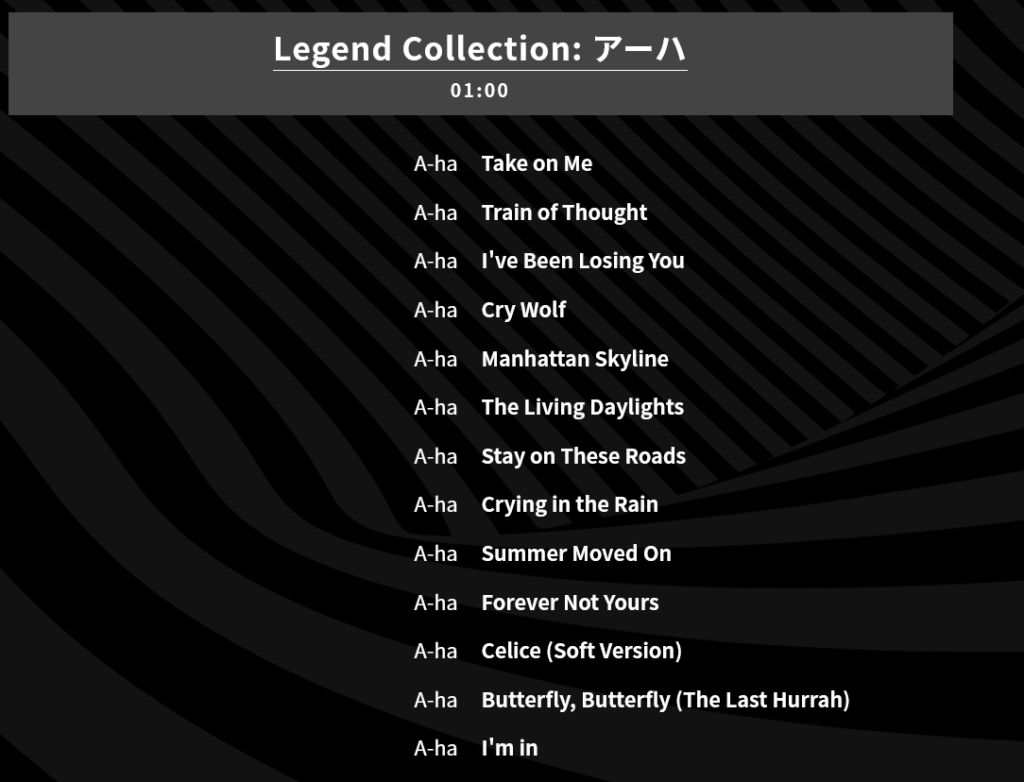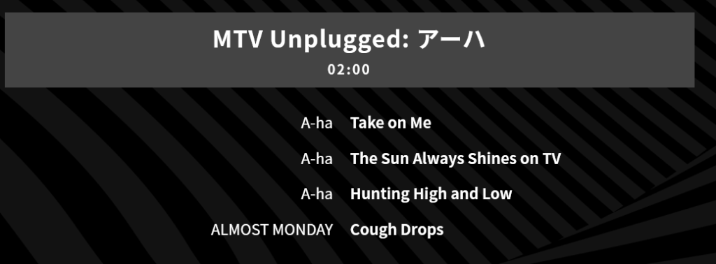 10月19日深夜1:00から放映されるMTV 『Legend Collection』とその後の『MTV Unplugged』ですが、前回では、『MTV Unplugged』の余った時間で『Take On Me』と『The Sun Always Shines On TV』と『I’m In』が流れました。今回はもしかして、『You Have What It Takess』が流れるかもと期待したところ、『Legend Collection』のほうで『I’m In』が流れることがわかりました。