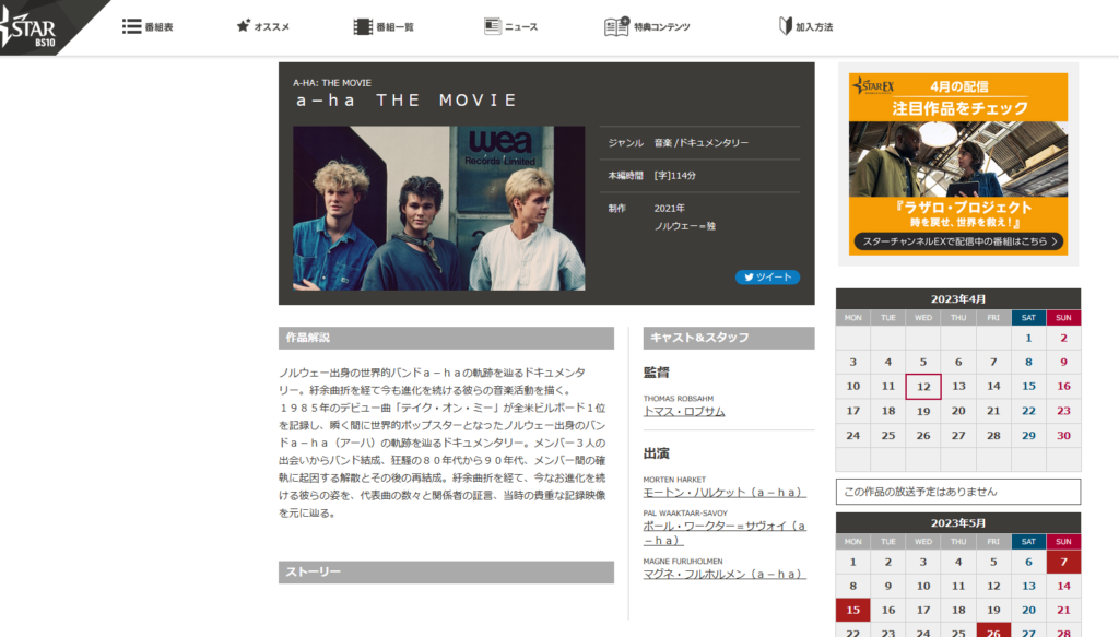 『a-ha THE MOVIE』がスターチャンネルで5月7日(日)12:00、5月15日21:00、5月26日11:00に放映されます。初放映が5月7日ですね。